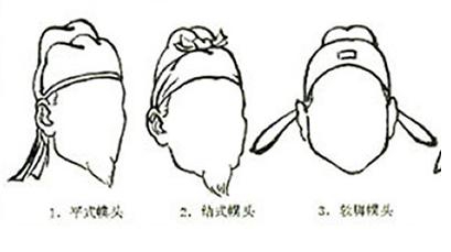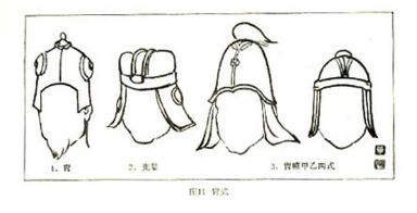缁撮(即黑色小巾)束结在头顶的发髻上,两脚自然地后垂。在商、周、春秋战国以及秦汉两代多为文人辩士所好戴,至唐代以后各代多为官吏在家“宴居”时所用,历代皆沿用,武将壮士也好戴用。
